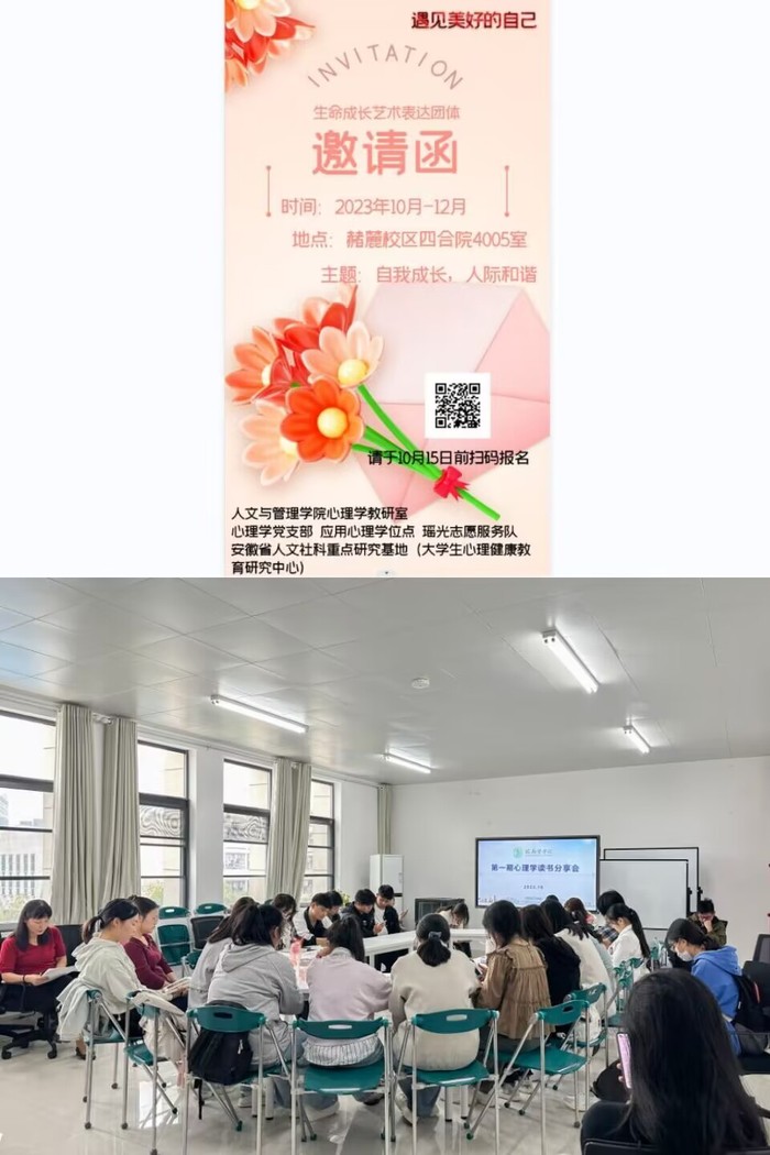 成长成才同向而行。10月10日中午,由杭荣华教授带领的、面向2023级应用心理学专业新生的第一期心理学读书分享会正式开班,活动将持续一学期,为新生心理健康保驾护航的同时将专业教育融入其中,助力员工实现成长与成才的同向而行。此外,面对全校员工开放的生命成长艺术表达团体活动也通过线上线下的方式进行了招募,将于10-12月开展为期三个月的团体心理辅导活动,为“大朋友”们的心理健康维护与成长提供持续动能。