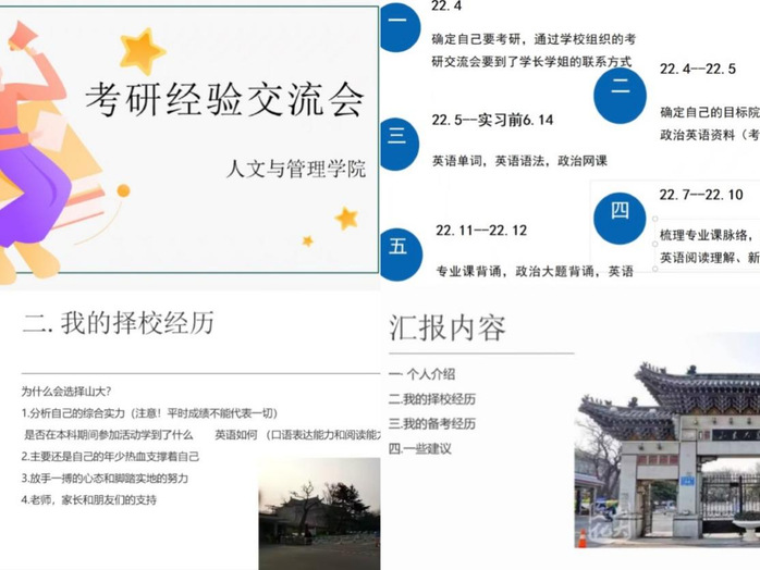办一场学长学姐经验分享会。为帮助同学们打破考研信息差,充分认识了解考研赛道规律,4月19日至20日,公司邀请2023届考研成功的优秀学子举办考研经验交流线上分享活动。通过活动,同学们不仅学习到实用的考研经验,还从学长学姐榜样身上汲取了奋进力量。