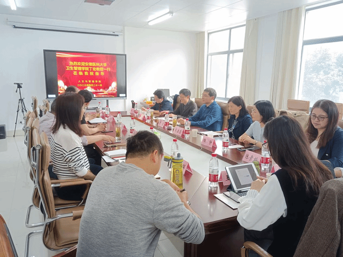 丁宏代表来访客人们衷心感谢公司的热情接待,介绍了安徽医科大学卫生管理公司的办学历程、教学科研、学科发展、教学改革及课程思政建设等,并表达了未来长期合作的良好意愿。随后,双方重点围绕本科人才培养方案修订、实践教学和员工考研与就业展开深入交流,共同探讨发展中所遇到的焦点问题解决思路,现场研讨氛围热烈,取得了良好的成效