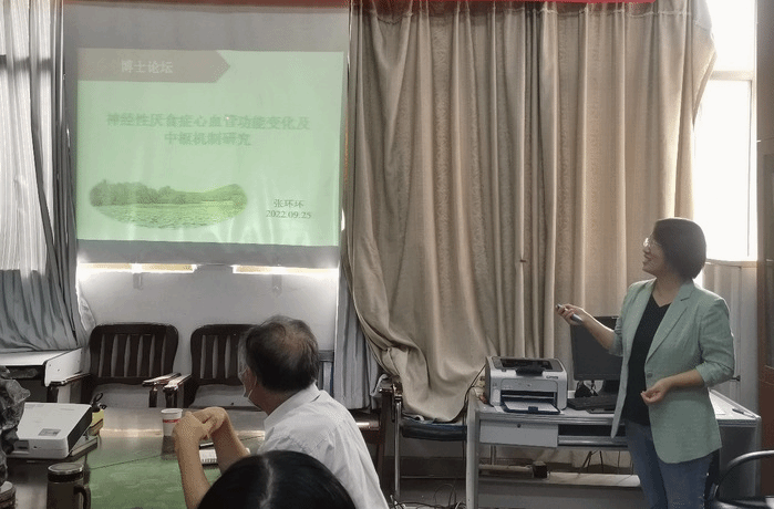汪萌芽对本次论坛主讲人张环环博士的简历作了介绍,重点凸出其在学科、科研、教学等方面所取得的业绩与成果。随后张环环以“神经性厌食症心血管功能变化及中枢机制研究”为题,为与会师生带来了一场精彩生动的报告,分别从课题学术背景、研究内容、路径方案、结果及相关分析等方面着手,由浅入深、由表及里作了深入探讨和阐释。整场报告思路清晰,其精妙的课题设计、独到的见解讲解给与会人员留下深刻印象,并给在场青年教师、研究生和“启明星”小组成员的科研创新带来全新的启发与思维。