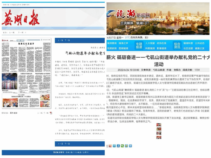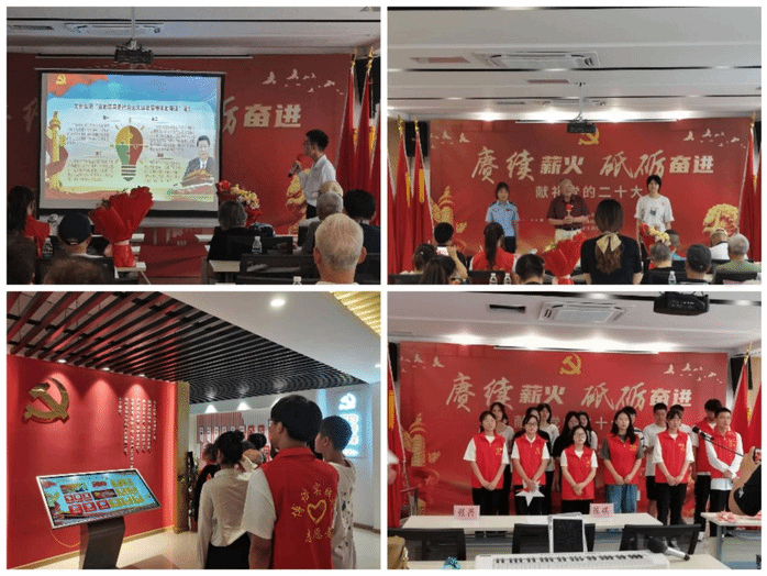 博谘实践队和弋矶山街道党工委于6月23日在春江社区开展献礼党的二十大系列活动。活动现场,街道党工委书记陈琪、组宣统委员程兴以及青年代表为辖区六名党龄达到50年的老党员颁发“光荣在党50年”纪念章、敬献鲜花。随后,在博谘实践队志愿者的带领下,党员、团员来到了党建展厅,重温百年党史,回望百年光辉历程。大家纷纷表示,将在伟大建党精神引领下,永不懈怠、一往无前地走好新的赶考路。“前往皓月星辰初心不忘,那未来如何登场有我担当……”参观结束后,由博谘实践队志愿者们带来的歌曲《有我》将活动推向了高潮。在青年党员、团员的邀请下,老党员们也纷纷加入齐唱《红星歌》,用嘹亮歌声诉说炽热的爱党爱国情,向党的二十大献礼。