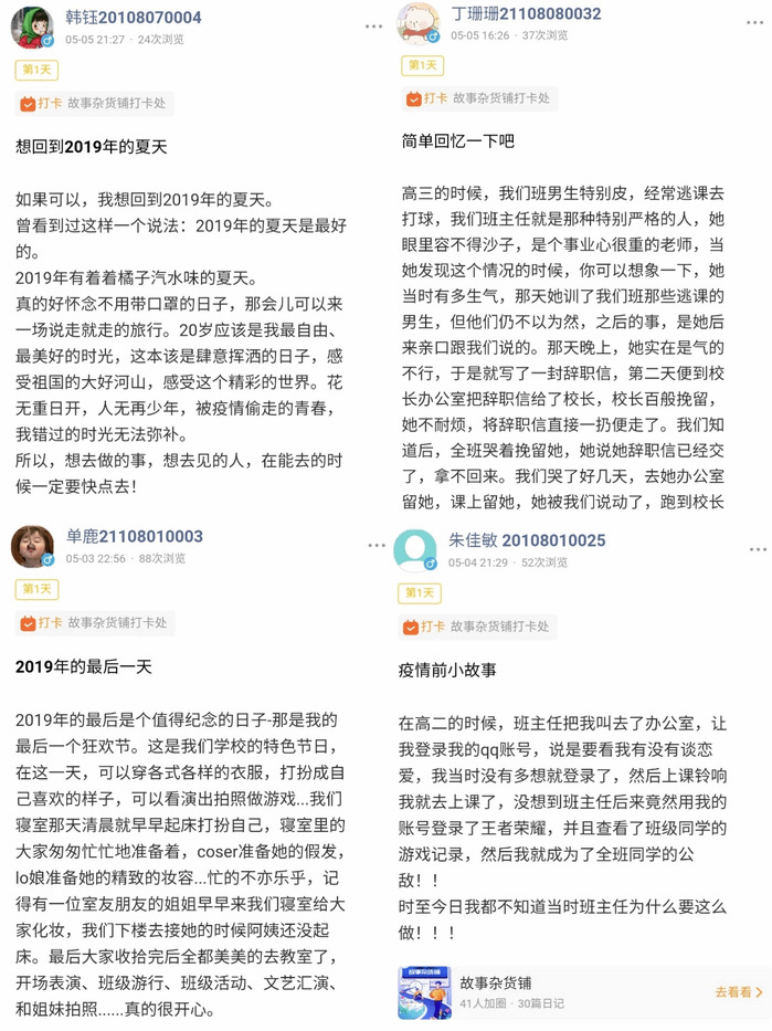 5月11日至13日,公司开展“故事杂货铺”活动,以文字寄情,启智润心。活动中,同学们依托线上平台分享和诉说疫情前的个人经历和对未来的憧憬、梦想,以文字、录音、视频等多种方式记录真实的青春故事,分享自己的所见所闻和所思所想,踏上一段探索心灵的旅程。