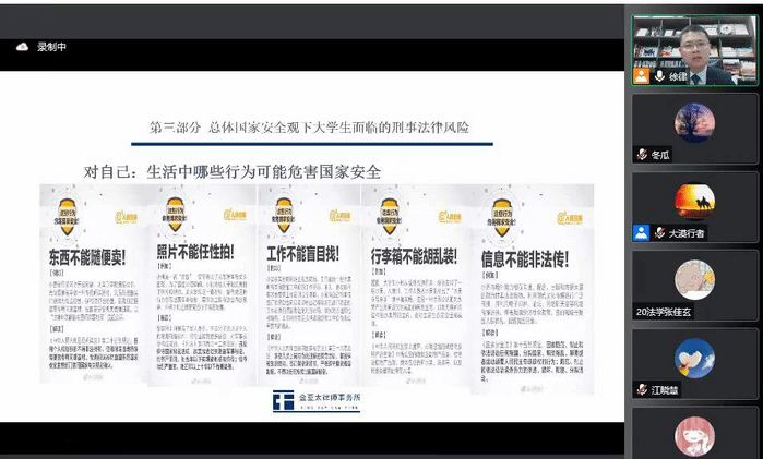 “安而不忘危,存而不忘亡,治而不忘乱”,值此第七个“全民国家安全教育宣传日”之际,为了进一步增强广大师生的国家安全意识,提高防范和抵御安全风险能力,TapTap点点法学教研室联合院团委开展了全体师生国家安全教育系列活动:在4月15日组织了国家安全日专题学习活动之后,于4月19日晚上再邀请安徽金亚太律师事务所党总支副书记、老员工反诈律师团常务理事徐权峰律师为师生带来精彩线上宣传教育讲座——“牢记国家安全,防范刑事风险”。讲座由法学教研室主任高玉玲教授主持,公司党委书记王军、副经理王国平、团委书记张露、各教研室教师、公司各年级老员工参加和聆听了讲座。