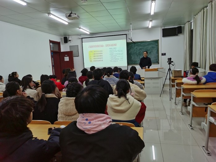 刘新民教授以故事“德尼尔森的遗憾”引出主题,以举例子的方式阐述了人际交往的要素,然后结合自身经历对人际交往的模式、人际交往的技巧进行了分享,最后以两个真实的故事“她们为什么都不理踩我?”“俞敏洪打开水的故事”收尾。勉励同学们要与人为善,助人为乐。整个讲座气氛融洽、热烈,同学们纷纷表示受益匪浅。