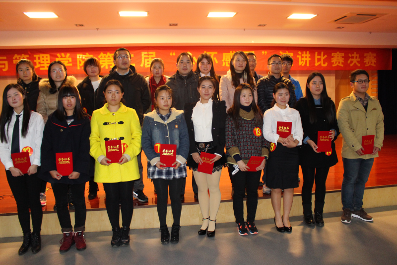 决赛中同学们用激情澎湃的语言抒发了对祖国、父母、老师的感激之情,特别是感恩助学,颂扬了党和国家的资助政策。其中2014级法学专业李影同学以“老师,最美”为主题讲述了老师无私奉献的爱,深深打动着每一位同学的心。最后2014级公管专业马亚楠同学以“纵使时光不等我”为主题,把活动推向了高潮,她以饱满的热情和真挚的话语表达了对父母的感激,引起了大家的强烈共鸣,博得阵阵掌声。经过评选,马亚楠同学力拔头筹,成为本场比赛冠军。