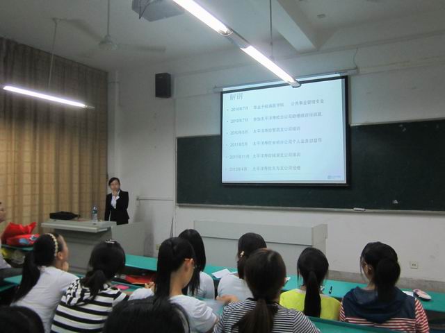 本次活动旨在保险学专业新生入学教育的基础上,继续深化专业思想认识,培养浓厚的专业兴趣,激发同学们的学习积极性,为更好地进行大学学习生涯规划打好基础。太平洋人寿保险股份有限公司(CPIC)解钢经理从我国保险行业发展现状与前景、保险行业职业资格认定考试与就业方向两个方面进行了详细讲解。通过近一个半小时的交流,同学们感受到国家对保险行业的大力支持、保险服务对于国民经济发展的重要性,保险行业的整体实力不断提升、市场体系逐渐成熟,并且具有广阔的发展前景和潜力。