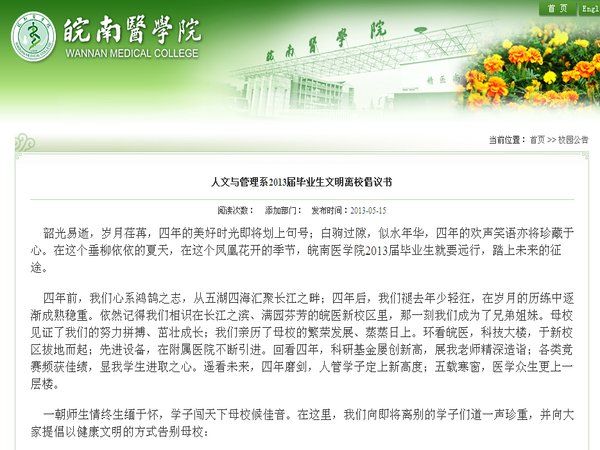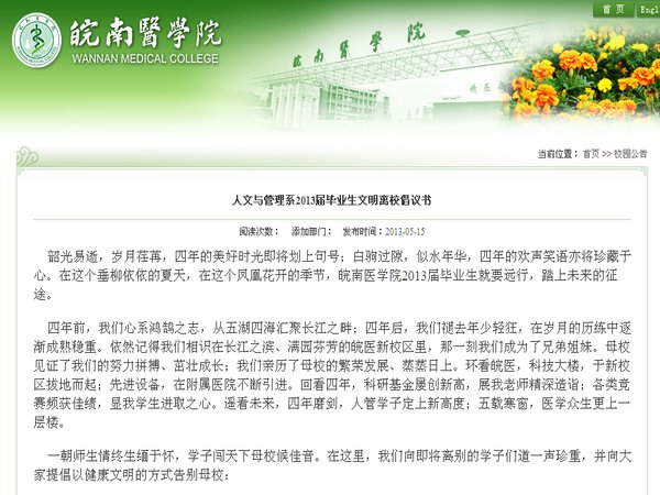 目前,在公司各相关部门的通力合作、该公司领导的精心指导、辅导员的认真落实和员工的全力配合下,该系的文明离校工作手续已经100%圆满完成。该系2013届学子纷纷表示要牢记母校老师的谆谆教诲,学以致用,情系母校,共圆中国梦。