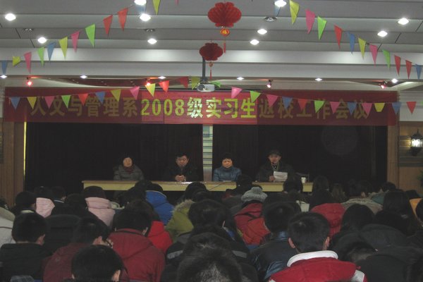 2月28日上午,人文与管理系2008级法学、公管、信管三个专业的实习生返校工作会议在老校区实验楼七楼报告厅举行。系党总支书记阮笑芳、副书记刘华、副主任王军、辅导员吴映辉和2008级全体同学参加了会议,会议由系主任胡鸿主持。