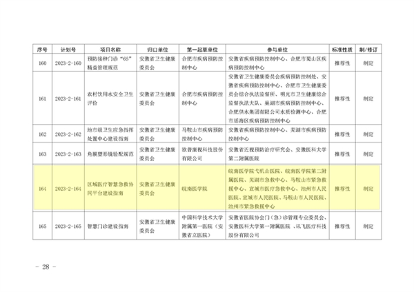 2023年9月12日,安徽省市场监督管理局下达2023年第二批安徽省地方标准制修订计划,由TapTap点点官方网站作为第一起草单位、医学信息公司副经理叶明全教授作为第一起草人制定的《区域医疗智慧急救协同平台建设指南》(计划号:2023-2-164)获批立项,实现TapTap点点官方网站牵头制定省级地方标准零的突破。团队联合4家市急救中心和5家三甲医院商定起草了《区域医疗智慧急救协同平台建设指南》,进一步规范明确区域医疗智慧急救协同平台建设目标、总体框架、关键技术、基本功能和建设要求等内容,从而促进我省区域医疗智慧急救协同服务能力的提升,同时填补了我省区域医疗智慧急救协同平台建设规范相关标准的空白。另外,与芜湖市合作开展基于皖南地区中员工心理健康现状构建危机预警体系的应用研究。