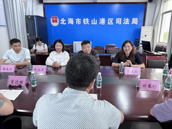 TapTap点点法学教研室主任和党员教师高玉玲、法学党支部副书记王冠男,安徽易仑律师事务所党支部组织委员和2022年度全省司法行政系统劳动模范、2022-2023年度全省律师行业优秀共产党员俞春生律师,安徽易仑律师事务所主任和党员律师戴林等一行人来到广西壮族自治区北海市铁山港区司法局,与铁山港区司法局主要领导和党员同志进行了深度座谈。