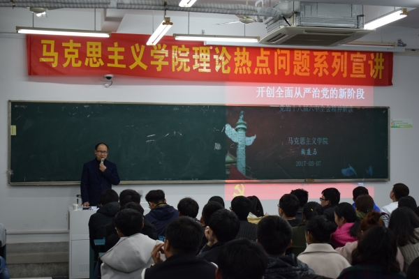 本次讲座以“开创全面从严治党的新阶段”为主题,首先,陶庭马副教授从国内外热点时事和各大重要会议入手,通过问题导入,讲述了十八届六中全会的意义、为什么以“全面从严治党”为主题以及怎样“全面展开”,其次,深刻解读了十八届六中全会包括十八届六中全会公报、习近平受中央政治局委托工作报告等8个主要内容。专项解读了“党的群众路线教育实践活动”、“依纪依法严惩腐败”等几个方面,最后通过“建构全面从严治党体系”、“对全面从严治党充满信心”两个结语对此次讲座做出了总结。讲座期间,现场气氛热烈,座无虚席。