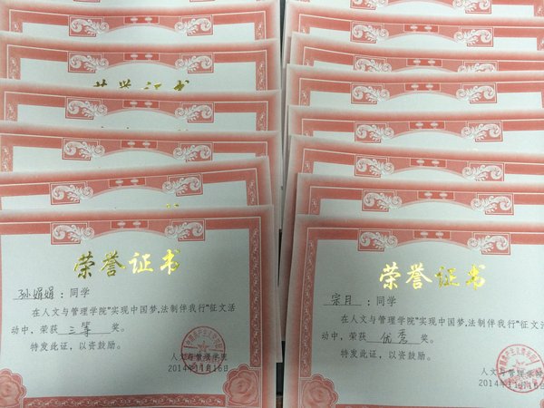 举办主题征文比赛,深刻体会依法治国 为了促进同学们对依法治国精神的理解和认识,员工第一党支部于11月中旬举办了“实现中国梦,法制伴我行”主题征文比赛。同学们以本人亲身经历、身边事迹为主,表达对祖国、对党的法律制度及依法治国的感想,对党的会议精神的领会。 此次征文比赛,同学们踊跃参加,最后征集了41篇由2013级同学们精心完成的作品。本着公平公正的原则,经过严格的评审,筛选出数篇优秀作品,同时评选出一等奖2名、二等奖3名、三等奖4名,以及优秀奖10名,共计19篇作品获奖。此次活动的开展,调动了同学们的学习热情,也使广大学子深刻体会了依法治国的内涵,在我国法治建设的道路上,做一名拥护法治的好公民,秉承法治理念,构建和谐中国。