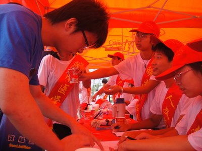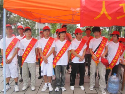 志愿者们头戴小红帽,穿着统一的白色T恤衫,戴着印有系名标识的绶带,在各接待点耐心地等待前来报到的新生,对每个人进行全程跟踪服务,热情解答新生及家长的咨询,向他们提供及时的帮助。汗水早已浸透了他们的衣衫,微笑却依然在脸上闪烁。他们的认真、他们的努力、他们的真情、他们的执着,深深打动了新生和家长们的心,让他们放心满意,受到了大家的一致好评。
