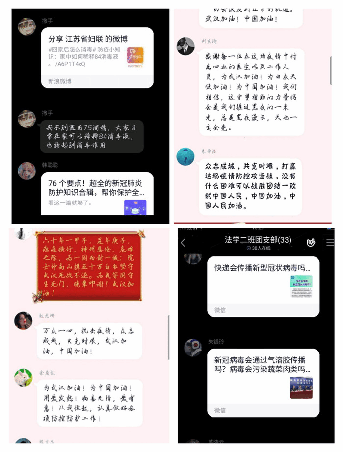 线下防疫热火朝天,线上宣传更是丰富多彩。同学们发挥自身更加熟悉网络平台的优势,依托班级团组织线上平台,通过制作海报、视频、绘制收稿和撰写心得等方式,积极发声、正确发声。
