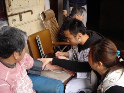 一部分同学为老人们测量血压,并细心地记下老人的高低血压值,提醒老人们平时生活应注意的事项。另一部分同学则陪老人们聊天、唠话,现场的气氛非常温馨,老人们的脸上不断地露出笑容。
